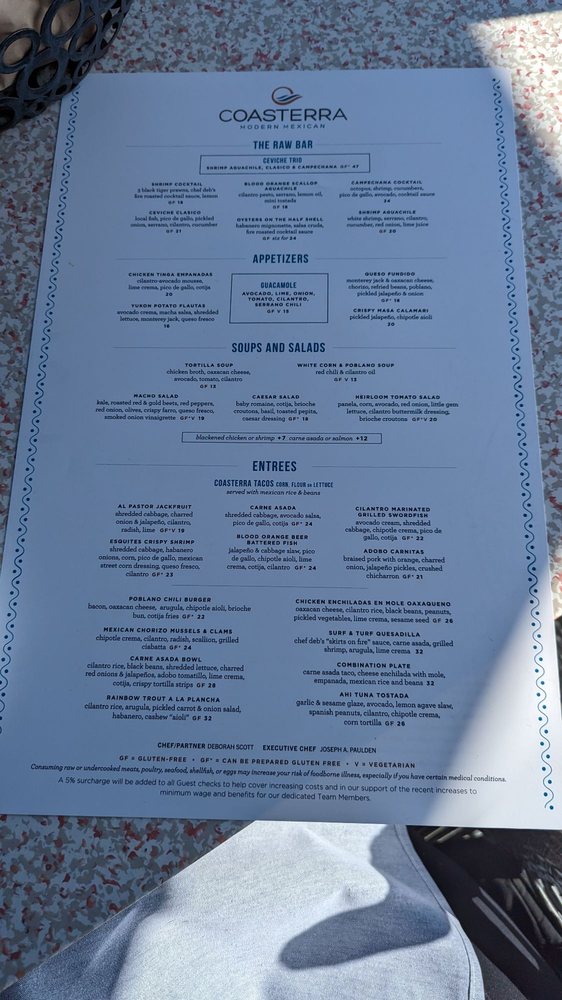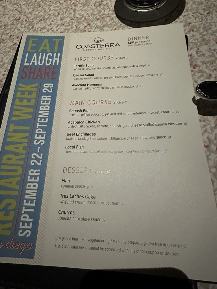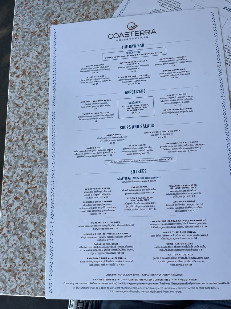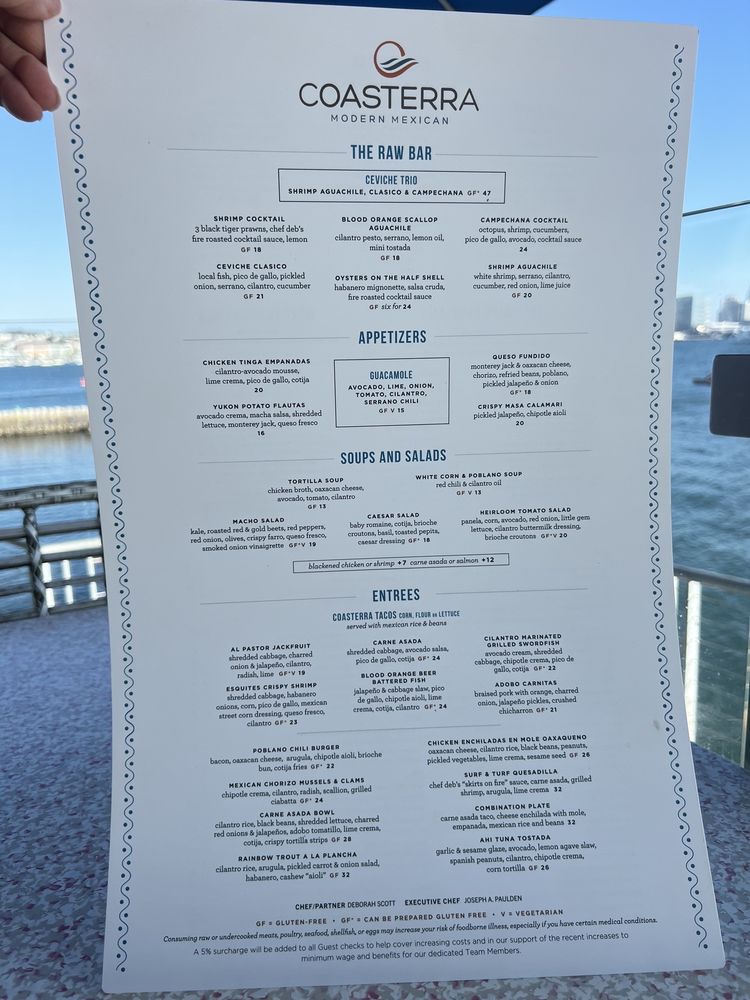 Located in San Diego, Coasterra offers a wide array of dining experiences, from vegan options to private dining and outdoor seating with stunning views of the bay. The menu features delectable desserts like Buttercake pineapple & dark rum compote and innovative libations such as Marigold Carajillo and Peanut Butter Chocolate Old Fashioned. Visitors rave about the seafood tacos and street corn, while also praising the attentive service and ambiance. The restaurant's attention to detail and fantastic flavors make it a must-visit for anyone in the area. With options for group gatherings, date nights, or just a casual lunch, Coasterra caters to a diverse range of tastes and preferences. Whether you're looking for a memorable dining experience or simply craving some delicious food, Coasterra delivers on all fronts.